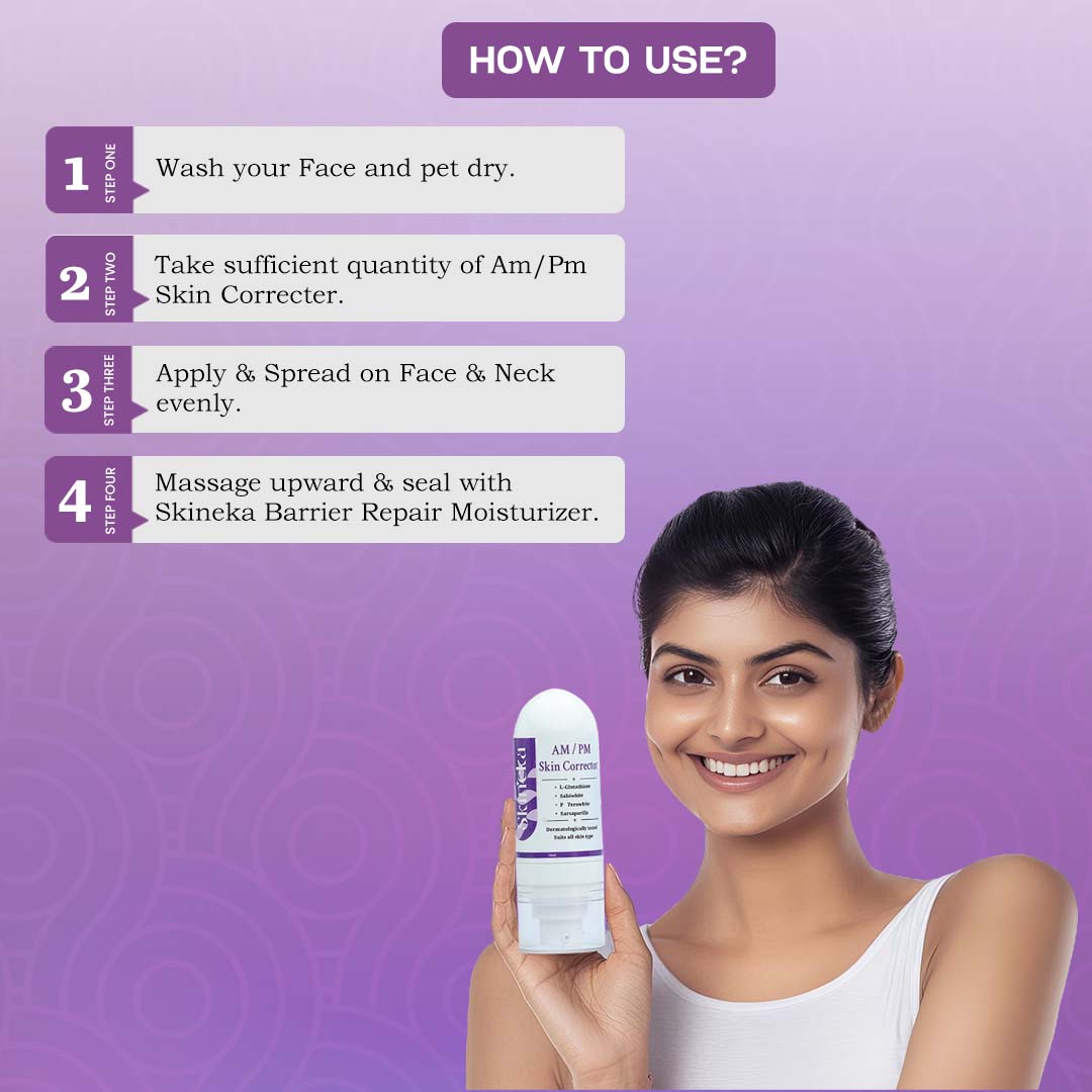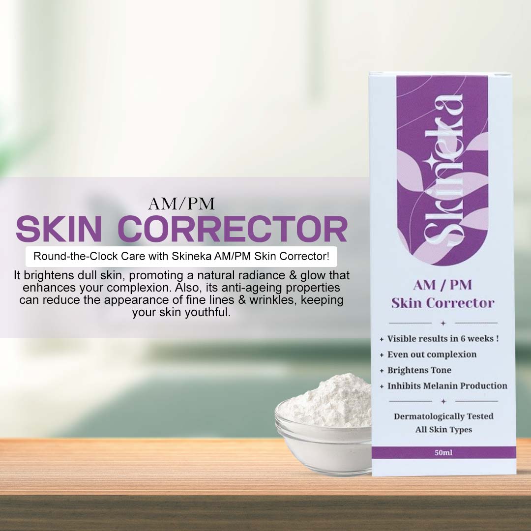 1- AM/PM Corrector-- Boasting a powerful formula, this skin corrector works to address multiple skin concerns in one go. It brightens dull skin, promoting a natural radiance and glow that enhances your complexion. Also, its anti-ageing properties can reduce the appearance of fine lines and wrinkles, keeping your skin youthful. It targets marks, spots, and pigmentation, working to fade them for an even skin tone.