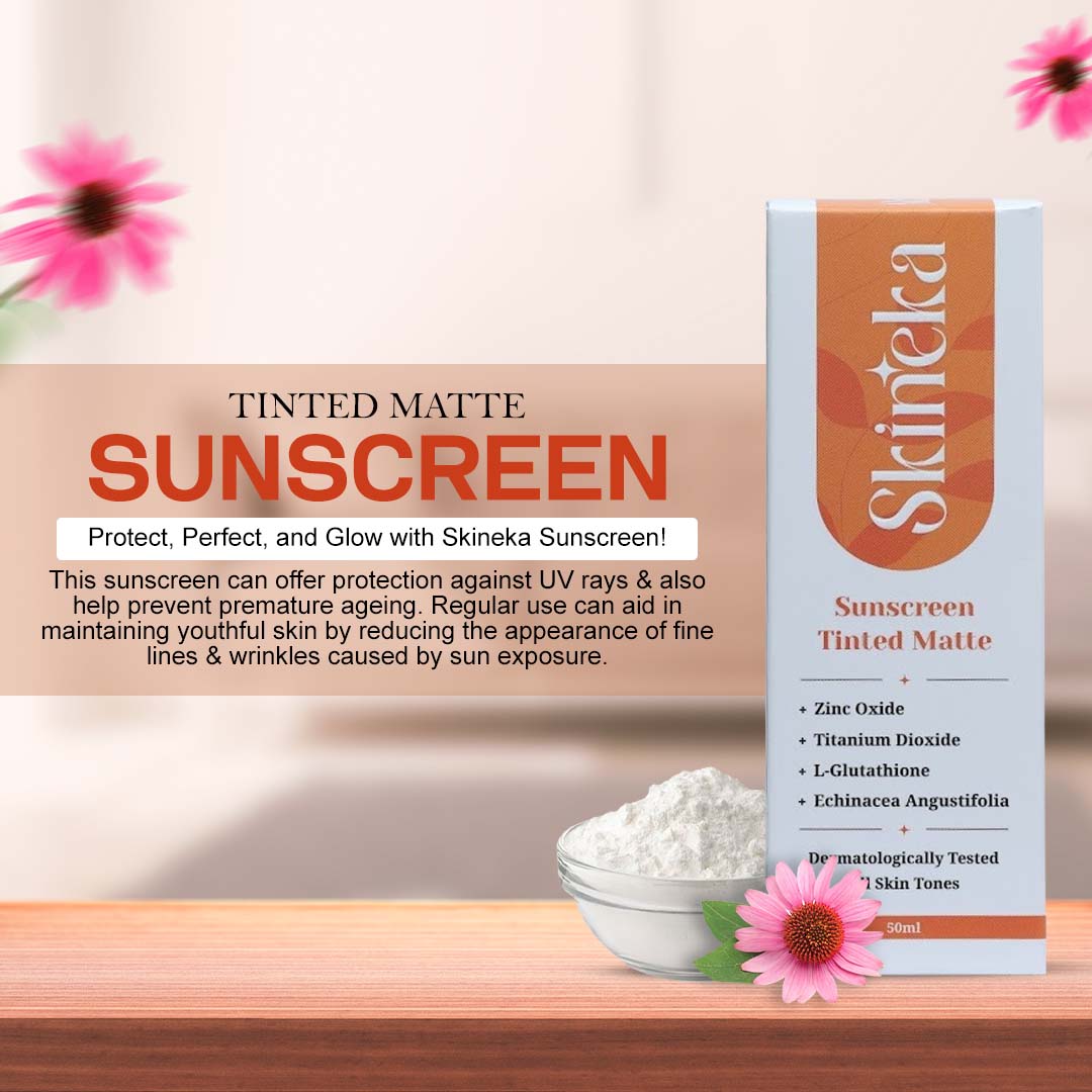 4- Sunscreen-- Protect your skin from harmful UV rays with Skineka Sunscreen. With SPF 50 PA++++ and a tinted matte moisturizer formula, this sunscreen offers all-day protection while giving you a flawless finish. Stay safe and stylish with Skineka.